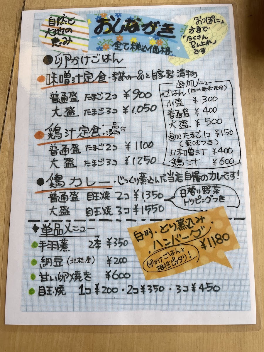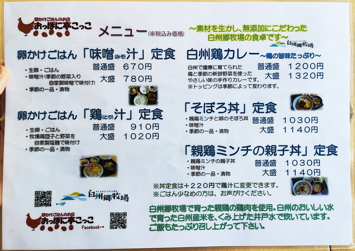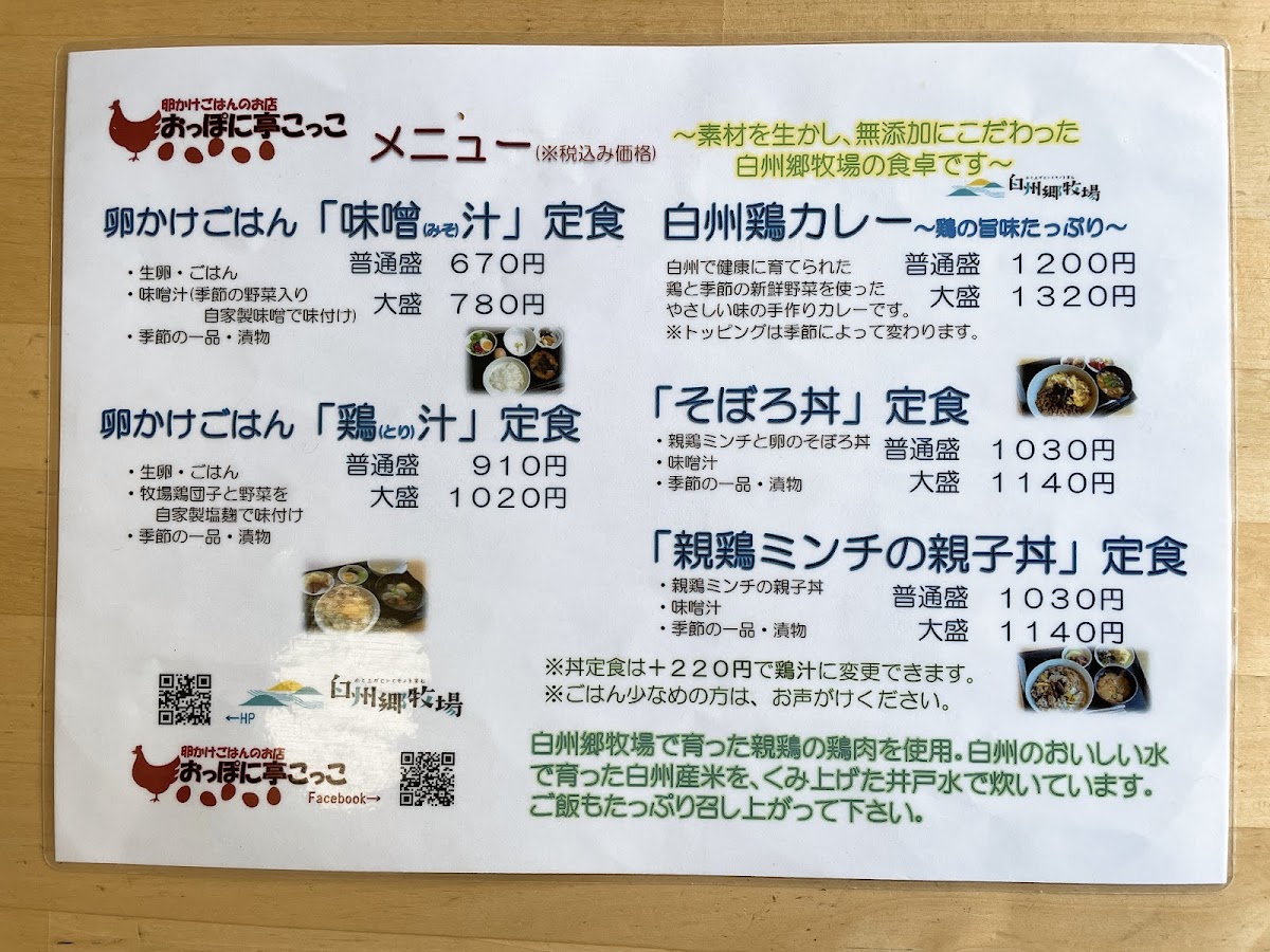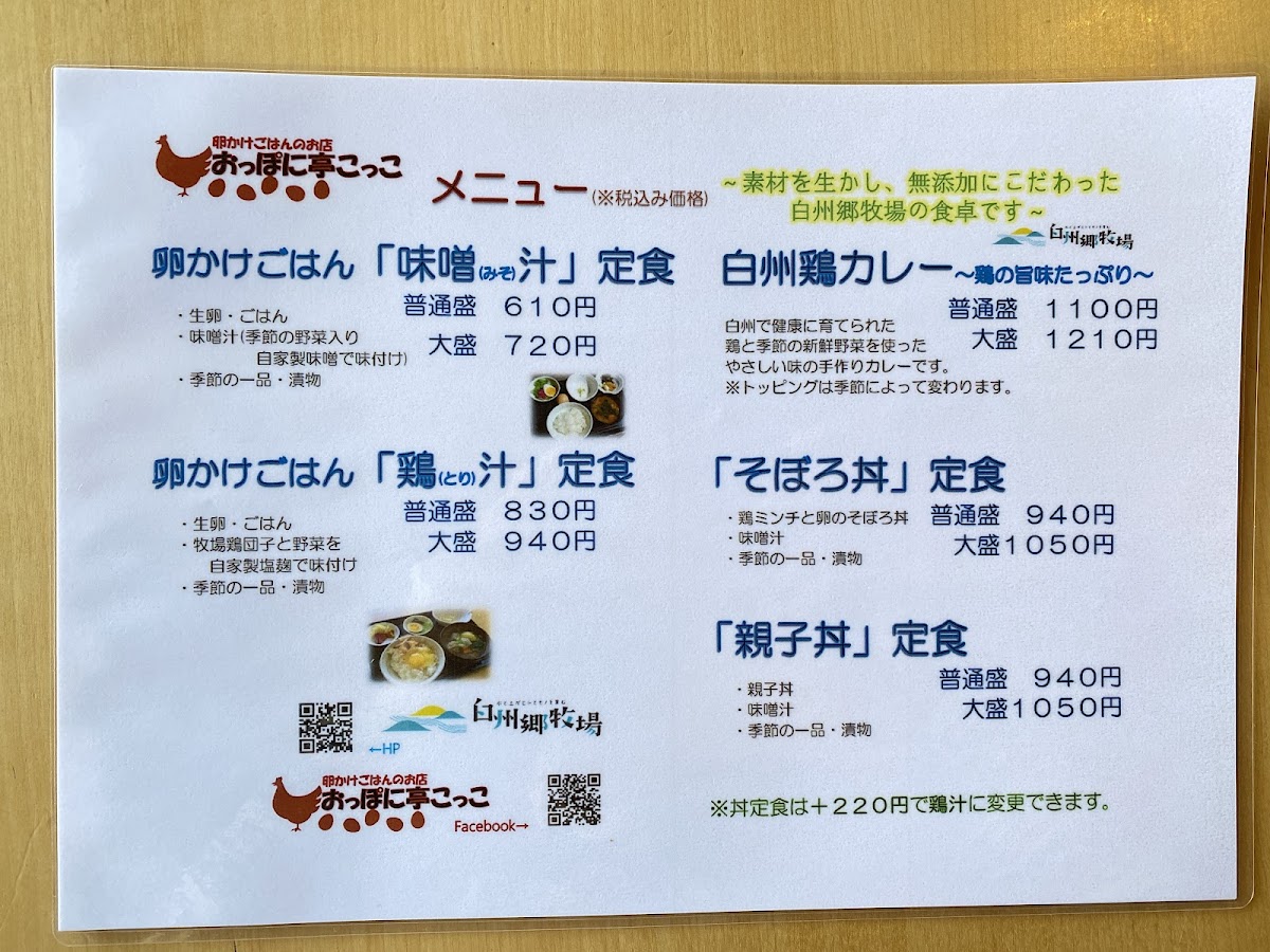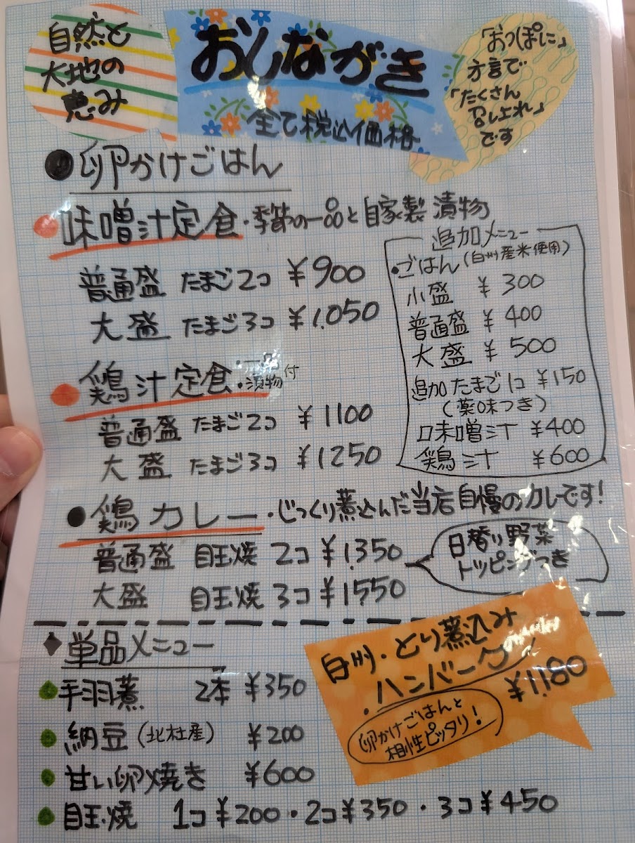 Opponi-Tei Kokko offers a menu that highlights the rich flavors of locally sourced ingredients, particularly focusing on eggs and chicken. A standout item is the 卵 かけ ご飯 味噌汁 定食, a comforting set meal that pairs fresh egg over rice with a savory miso soup, perfect for those seeking simplicity and satisfaction. Another signature dish is the 白州鶏カレー, a flavorful curry made with tender local chicken, ideal for curry lovers. For those craving something unique, the 卵の黄身 provides a delicate, rich egg yolk, while the 甘い卵焼き offers a sweet take on the classic Japanese omelet. The 手羽煮 is a deliciously tender braised chicken wing, full of umami. Additionally, the 鳥汁定食 serves a hearty, flavorful chicken broth, perfect for a wholesome meal. The たまごプリン is a must-try for dessert, with its smooth and creamy texture making it a crowd favorite. For those wanting to enhance their curry experience, the 白州鶏カレー おかわり卵乗せ allows a second helping of curry with the added richness of egg. The そぼろ丼定食 鶏汁変更 and 鳥のそぼろ丼 are both hearty rice bowls, with the latter featuring a savory chicken minced topping that pairs beautifully with the rich broth. With its focus on eggs and chicken, Opponi-Tei Kokko delivers a satisfying and comforting dining experience.